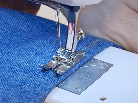 - Sewing machine assembles denim panels.